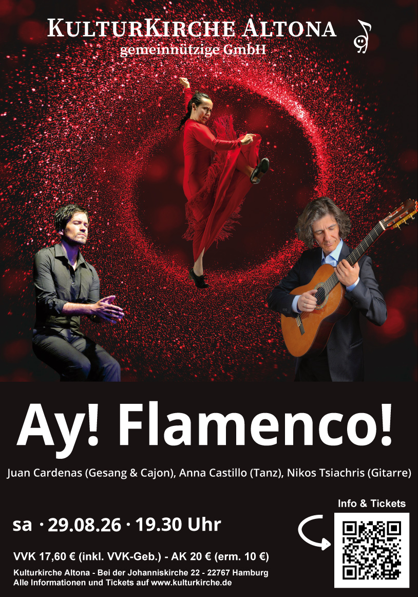 Erleben Sie mit dem Sänger Juan Cárdenas, der Tänzerin Anna Castillo und dem Gitarristen Nikos Tsiachris die drei Gesichter des Flamenco: Gesang, Tanz und Gitarre - in einem Bogen von der Tradition bis in die Moderne. Ein Abend, der uns unmittelbar die flirrende Hitze Südspaniens spüren lässt und sich durch Leidenschaft, Emoción und einen energiegeladenen Rhythmus auszeichnet.