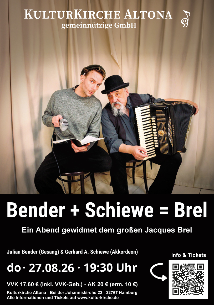 Julian Bender (Gesang) und Gerhard A. Schiewe (Akkordeon) folgen diesen Blicken, lassen Brels Figuren wieder aufleben: den Träumer, den Spötter, den, der zu spät begreift.