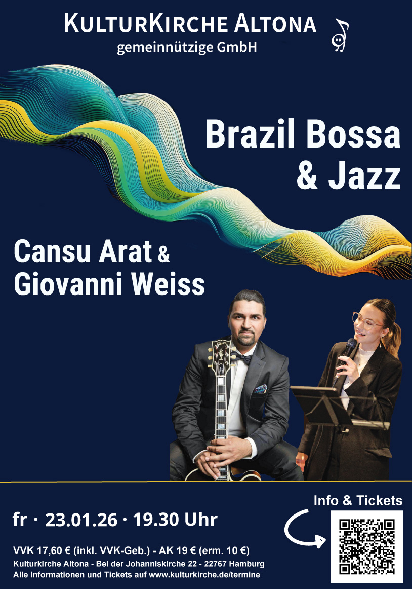 Wenn Jazz-Tradition auf junge, frische Ausdruckskraft und eine Ausnahmestimme trifft, entsteht Musik, die berührt und begeistert: Giovanni Weiss & Cansu Arat. Das Duo widmet sich an diesem Abend neben einigen Jazz-Standards vor allem bekannten und beliebten Klassikern der brasilianischen Bossa Nova und Antônio Carlos Jobim, dem Komponisten von Welthits wie z.B. "Girl from Ipanema", "Chega de Saudade", "Triste", "Wave" u.v.a.