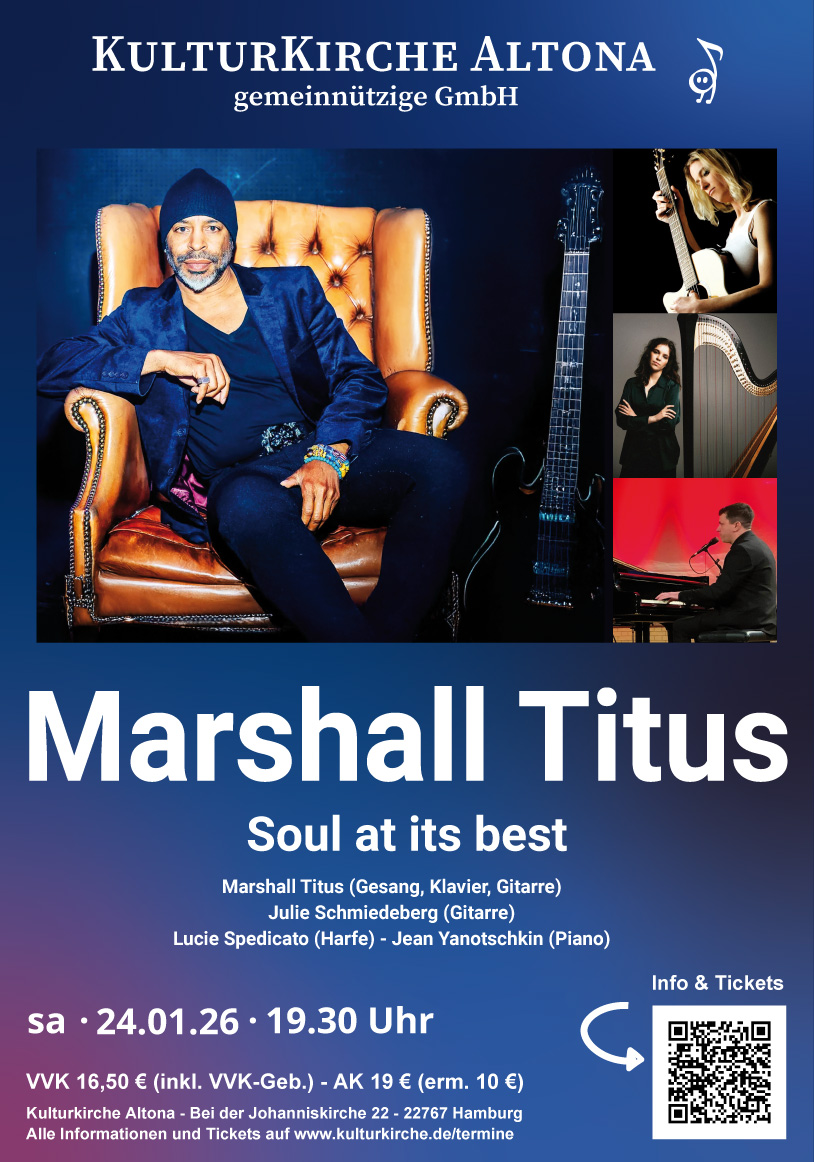 Seine Soulstimme ist unverkennbar - leidenschaftÂlich, rau, sinnlich, geerdet und voller Lebenskraft: Marshall Titus, Sänger, Pianist, Gitarrist & Songwriter, kehrt mit neuen Songs auf unsere BĂĽhne zurĂĽck und sein warmes Timbre wird die Kulturkirche Altona wieder mit Songs erfĂĽllen, die vom Leben in all seinen vielen Facetten erzählen - präsentiert in einem intimen Rahmen fĂĽr eine Stimme, Musik und Texte voller Seele.