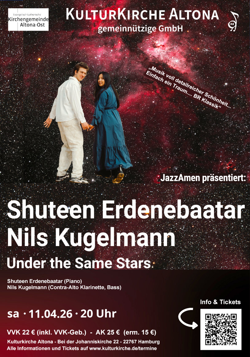 Beide haben sich in den vergangenen Jahren als prägende Persönlichkeiten einer neuen Generation etabliert. Shuteen Erdenebaatar, geboren in der Mongolei, lebt seit 2018 in Deutschland. Sie wurde u. a. mit dem Deutschen Jazzpreis und dem höchsten Kulturpreis ihrer Heimat ausgezeichnet. Nils Kugelmann, ACT-Künstler und ebenso mehrfach preisgekrönt, ist bekannt für seine Arbeit mit seinem eigenen Trio sowie seiner Handschrift als Komponist.