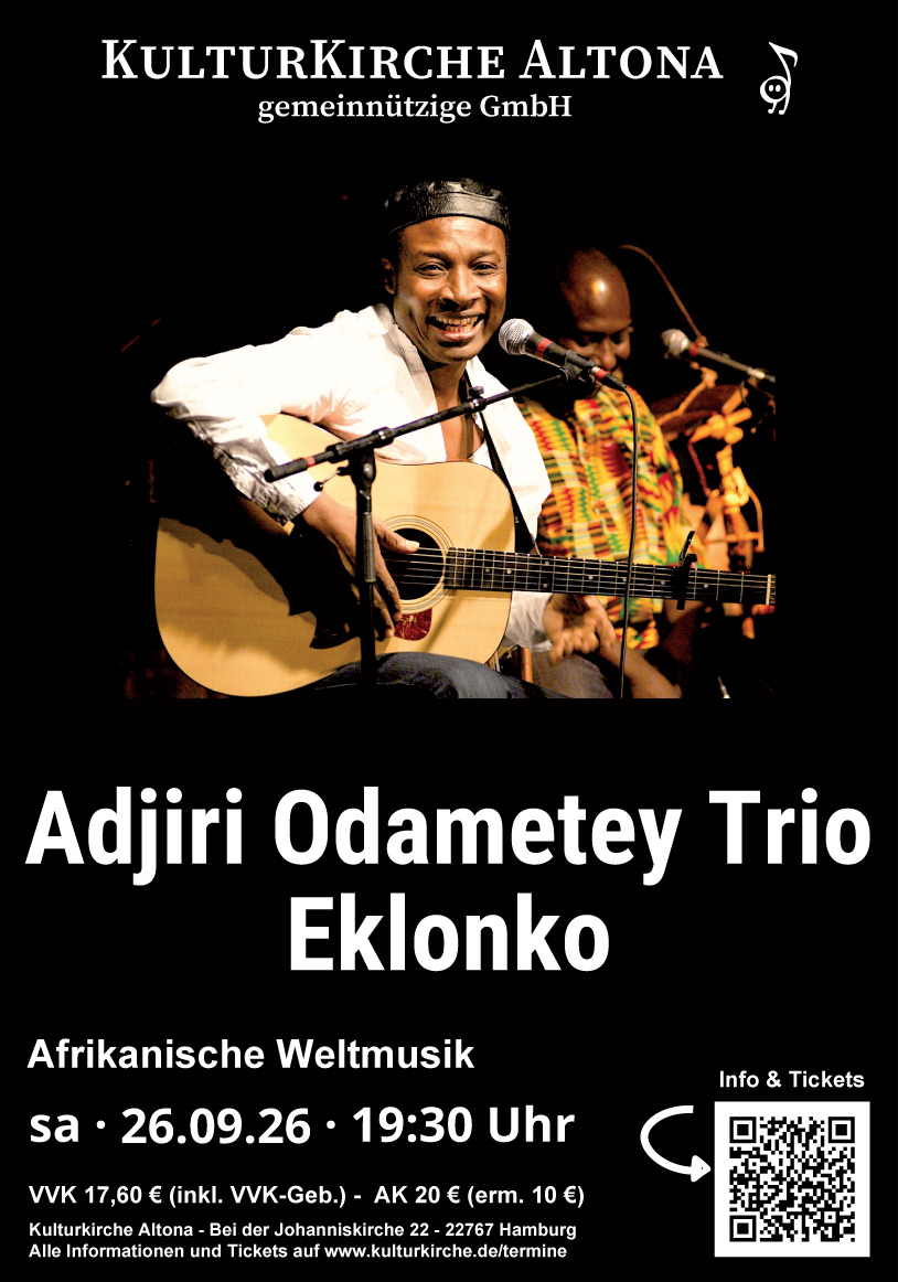 Sein Markenzeichen ist seine warme, erdige Stimme. Der Multi-Instrumentalist Adjiri Odametey beherrscht Instrumente wie die Daumenklaviere Mbira und Kalimba, Kora, Balafon und Gitarre und zählt zu den beeindruckendsten Vertretern afrikanischer Musik unserer Tage. Bekannt wurde er durch den Titelsong seiner ersten CD „Mala“. Nun präsentiert er mit seinem Trio seine aktuelle, vierte CD, „Ekonklo“.