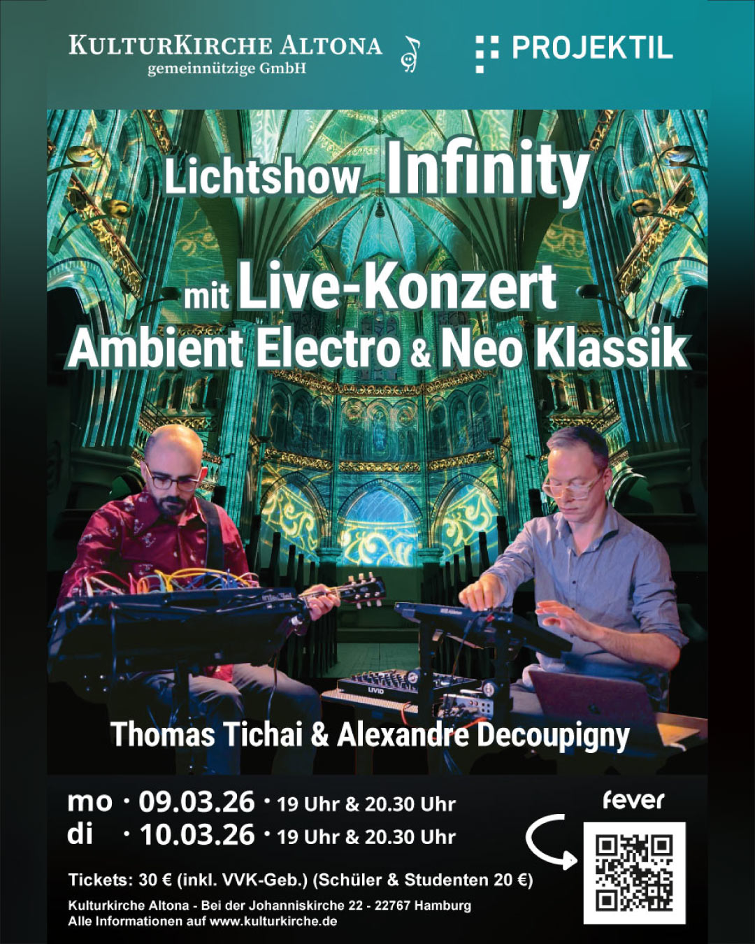 Dank mehrerer Hochleistungsprojektoren verwandelt sich die Kulturkirche Altona mit der neuen Licht-Show „INFINITY“ des Schweizer Künstlerkollektivs Projektil Experience mit exklusivem Livekonzert wieder in eine atemberaubende 360°-Kulisse für Augen und Ohren und nimmt uns mit auf eine 45minütige, audiovisuelle Reise durch die Unendlichkeit von Zeit und Raum.